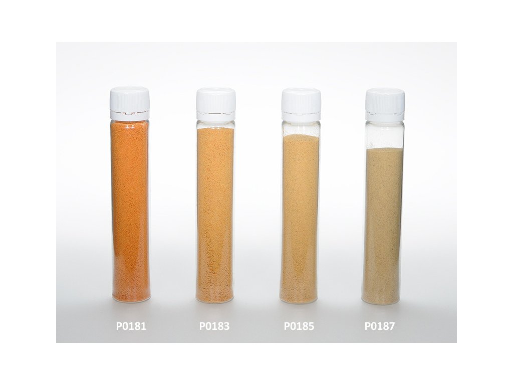 Oranžová paleta barevného dekoračního písku. K výběru jsou 4 odstíny ve dvou odlišných hmotnostních baleních (viz obrázek).