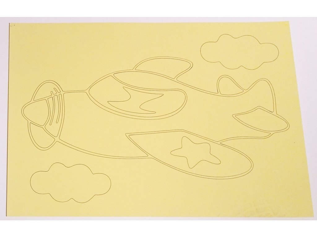 Unikátní motiv šablony Letadlo ve formě před řezané papírové samolepky pro tvorbu s barevným pískem. Obdélníková samolepicí šablona je ve 2 velikostech. Obrázek je na tvrdším kartonu. Šablona nebude trvale v nabídce.