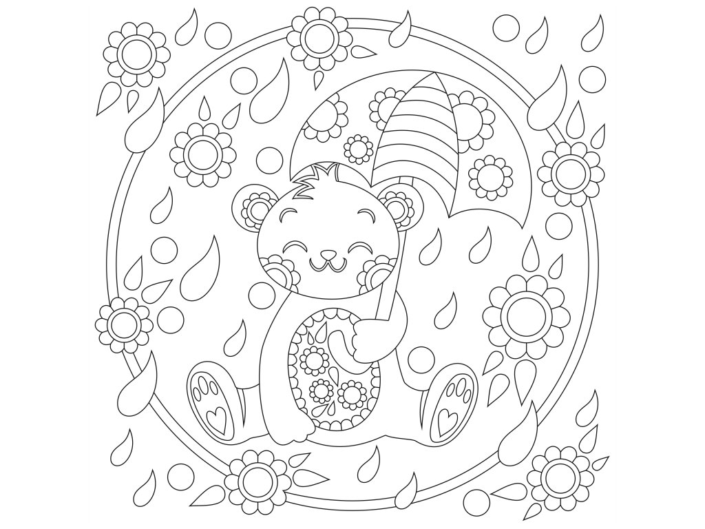 Unikátní motiv šablony Medvídek s deštníkem ve formě před řezané papírové samolepky pro tvorbu s barevným pískem. Čtvercová samolepicí šablona lze objednat v různých rozměrech až do velikosti 470 x 470 mm.