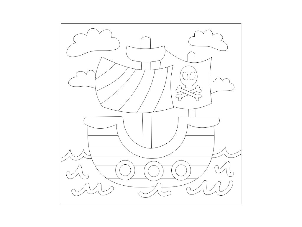 Unikátní motiv šablony Pirátská loď ve formě před řezané papírové samolepky pro tvorbu s barevným pískem. Čtvercová samolepicí šablona lze objednat v různých rozměrech až do velikosti 470 x 470 mm.
