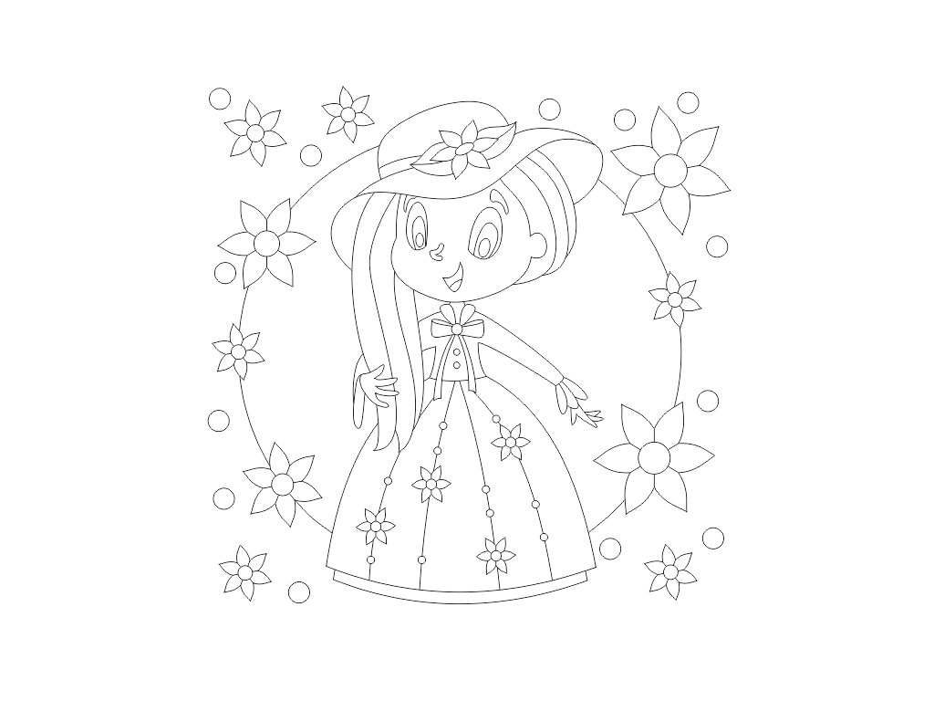 Unikátní motiv šablony Princezna s kloboukem ve formě před řezané papírové samolepky pro tvorbu s barevným pískem. Čtvercová samolepicí šablona lze objednat v různých rozměrech až do velikosti 470 x 470 mm.
