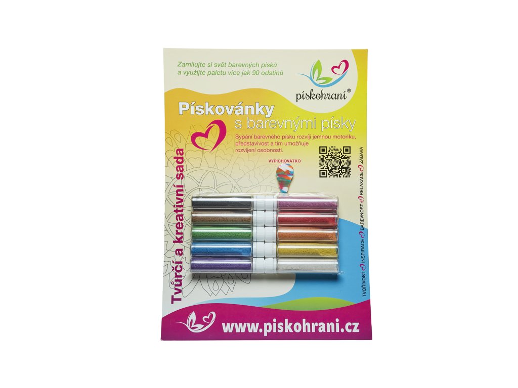 - 10 ks barevného písku v plastových lahvičkách (á 12 g). Kódy barevných písků v sadě: P0561 (černá), P0481 (hnědá), P0301 (zelená), P0141 (žlutá), P0181 (oranžová), P0421 (červená), P0401 (růžová), P0581 (modrá), P0381 (fialová), P0122 (bílá).